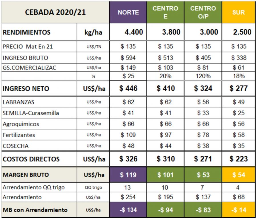 Las tablas 1 y 2 muestran el margen bruto para las zonas norte, centro (dividido en centro-este y centrooeste/pampa) y sur para los cultivos de trigo y cebada.