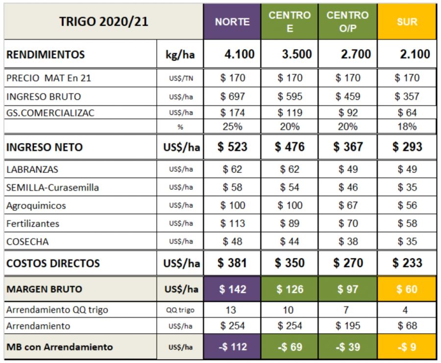 La sanidad del cultivo se logra con las aplicaciones de insecticidas y fungicidas. Los rendimientos de cada zona corresponden al potencial productivo, los cuales están en función de las características agroecológicas de cada región, y a un manejo sustentable. El arrendamiento se contempla en quintales de trigo a un precio disponible del cereal (U$S 19,5).