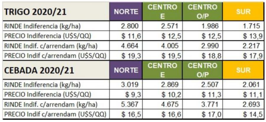 Los precios de los insumos sin IVA son actuales, mientras que el precio del trigo se obtiene de MATBA enero 2021 (U$S 170), en cebada se hizo el análisis con precio a dicene U$S 135. Finalmente los gastos de comercialización incluyen flete, impuestos y comisiones. Es importante recordar que los costos directos no contemplan los gastos de estructuras.