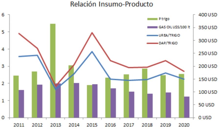 Próximos a iniciar la campaña de fina, el indicador económico más utilizado para determinar la decisión de fertilizar es la relación insumo-producto, que representa la cantidad de trigo necesaria para adquirir una unidad de fertilizante. Los valores promedios de esta década fueron de 2,7 en urea y 3,5 en fosfato diamónico (DAP). Este año el indicador para la urea es de 2,2 (14% menos al registrado durante la campaña pasada) y en DAP de 2,7 (19% menos que durante el ciclo 2019/20). Esta situación generaría una condición favorable, en cuanto a las dosis de fertilizantes a aplicar en la actual campaña, para mejorar la cantidad y calidad del cereal a producir. En cuanto al precio del gasoil se registra una importante disminución (-16%), al pasar de 97 a 82 U$S/100 l. Este escenario podría generar un aumento del área con labranza convencional debido a la reducción de los costos directos en el manejo de malezas.