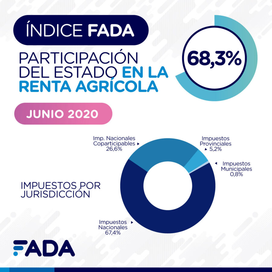 FADA (Fundación Agropecuaria para el Desarrollo de Argentina) publicó su característico Índice FADA. Este informe trimestral, que mide la participación del Estado en la renta agrícola, develó que de cada $100 de renta (ingresos menos costos) de una hectárea promedio, van $68,30 al Estado en impuestos nacionales, provinciales y municipales. Mientras que el promedio ponderado de cultivos a nivel nacional es de 68,3%, la participación del Estado en soja es del 69,7%, maíz 65,4%, trigo 67,8% y girasol 59%.