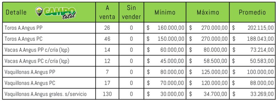 Los toros Angus PP de 2 años promediaron $ 214.613 mientras que los hiper porbados toros de 1 año llegaron a los $ 187.500. Por su parte los toros Angus PC de 2 años promediaron $ 198.333 y los de 1 año $ 175.000.