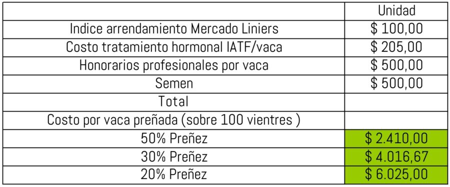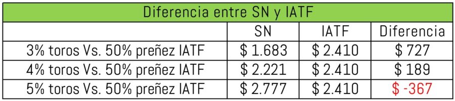 Como vemos en este cuadro, con los porcentajes “reales” del 4 y 5% de toros estamos casi en el mismo valor entre la preñez de SN y la de IATF, incluso con un 5% de toros es mas barata la preñez de IATF.
