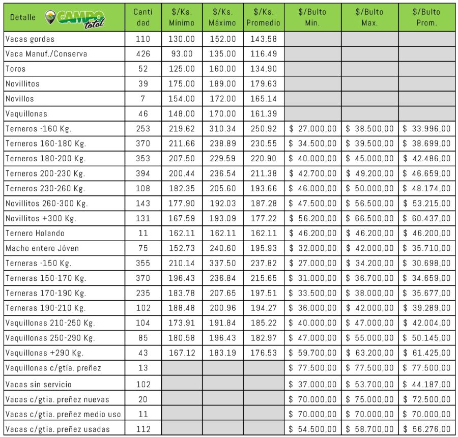 El cierre fue más trabajoso, con muchos vientres que no tenían tantas manos (falta de campo) y así hubo que ir vendiendo lote a lote, encontrando buenas respuestas en las vacías, vaquillonas y vientres nuevos con un mercado que se fue haciendo, pero mucho, mucho trabajo para colocar el vientre usado, donde de aquí al invierno se verá hasta dónde se puede seguir llevando a feria una mercadería que sin campos en la zona, se dificulta cada vez más.