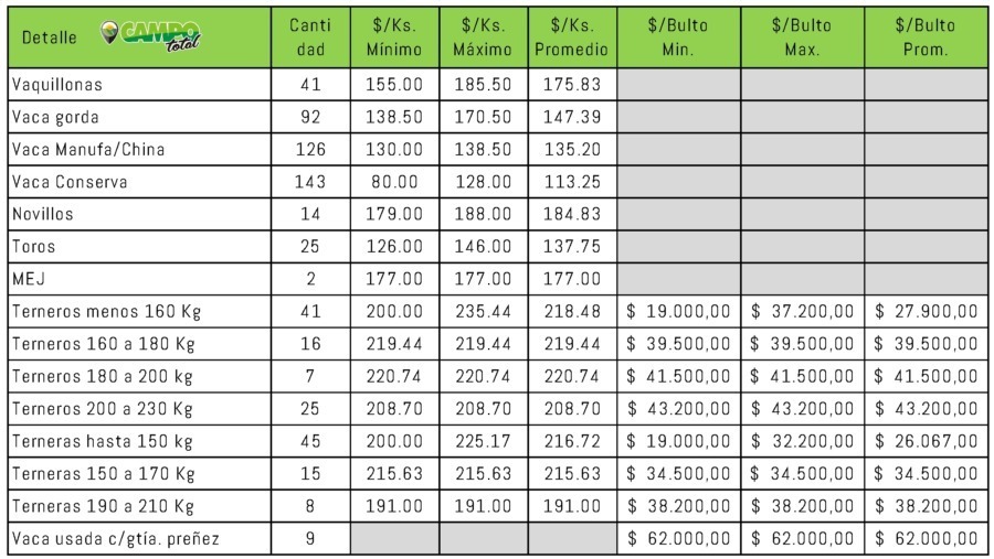Con plazo de 30 y 60 días y el martillo conpartido entre Ricardo y Tomás Arzoz en las instalaciones feria de la Sociedad Rural de Tres Arroyos éstos son los valores: