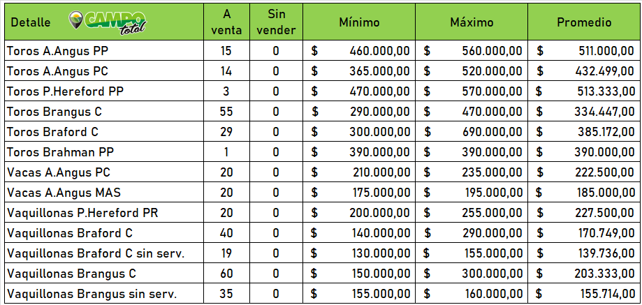 Hacienda de calidad, productiva y con rusticidad se comercializó por parte de todos los integrantes pero se destacó el interés por la cabaña de Sandungaray. Los vientres, tanto vacas PC como vaquillonas PR registraron un importante promedio. No fue menos la demanda por los toros, sobretodo para los Angus y Hereford de la cabaña regional con promedios difíciles de alcanzar en la provincia de Buenos Aires.