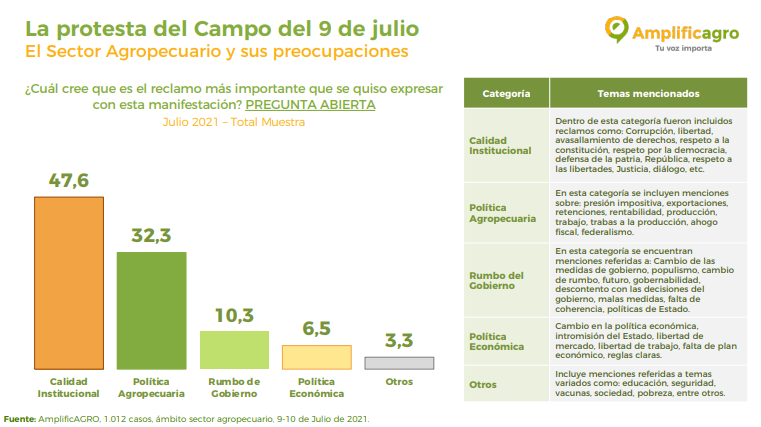 A la hora de señalar cuál fue el principal reclamo que se quiso expresar con esta manifestación, las diferentes respuestas se agruparon en 5 categorías: hubo un 47,6% que señaló que el principal reclamo tenía que ver con aspectos que hacen a la Calidad Institucional (Corrupción, Respecto a las libertades, Respeto a la Constitución, etc.), un 32,3% indicó reclamos que tenían que ver específicamente con aspectos de la Política Agropecuaria, un 10,3% señaló aspectos vinculados al Rumbo General del Gobierno, un 6,5% aspectos vinculados a la Política Económica, y un 3,3% que se inclinó por Otros asuntos como la Educación, la Seguridad y la situación sanitaria.