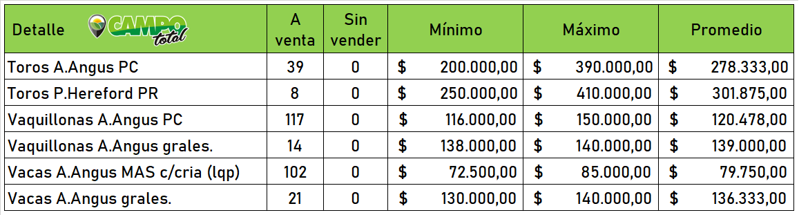 Compradores: Urruti, Barcelandi, Hansen, Omas SA, Don Franco, Sivero y Cía, Bonefón, Peñin, Ganadera El 21, Di Marco, Albertsen, El Diez, Duguine, Las Espuesla, Redolatti, Fernández, Plast, Trumil, La reserva, Néstor H. Fuentes, El Destino, Mauren, entre otros.