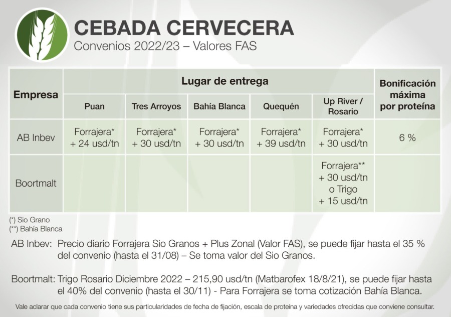 Respecto a condiciones, para cebada cervecera, para el ciclo 2022/23 se presentan las siguientes opciones bajo convenio: