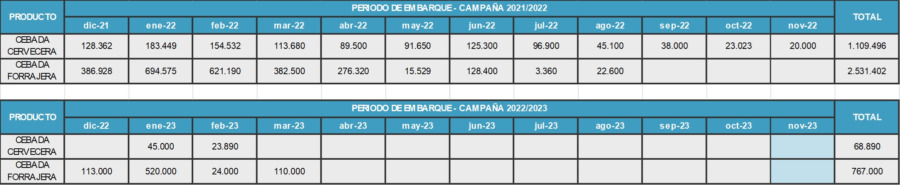 La Exportación, por cebada cervecera, está “manejando” los siguientes valores FAS: 300/310 usd/tn entrega julio 2022. Por cebada forrajera 265/270 usd/tn disponible julio 2022. Para campaña 2022/23, en un mercado volátil, se han ofrecido los siguientes valores, 295/300 usd/tn para cebada cervecera y 265/270 usd/tn para cebada forrajera, ambos para la condición enero 2023.