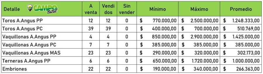 El turno de los embriones comercializados con líneas muy buscadas, los toros PC que con algunas obligaciones se fueron colocando en su totalidad y en donde el mercado le puso precio a una categoría bien comercial y lista para salir a trabajar.