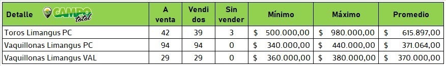 Ante eso, las vaquillonas rápidamente se fueron con mucha agilidad y valores mas que importantes tanto las PC como las VAL (Vientre Aprobado Limangus). Algo mas de 370 mil de promedio para toda la hembra sin dudas marca el interes de la demanda para la categoría.