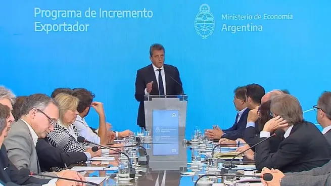 Junto a otros funcionarios de la cartera económica y representantes de distintas cámaras cerealeras, del maní, del vino, maíz y madera, entre otros miembros de economías regionales, el ministro anunció la puesta en marcha de dos esquemas cambiarios diferenciales para favorecer las exportaciones, en especial en el contexto de sequía que atraviesa el país.