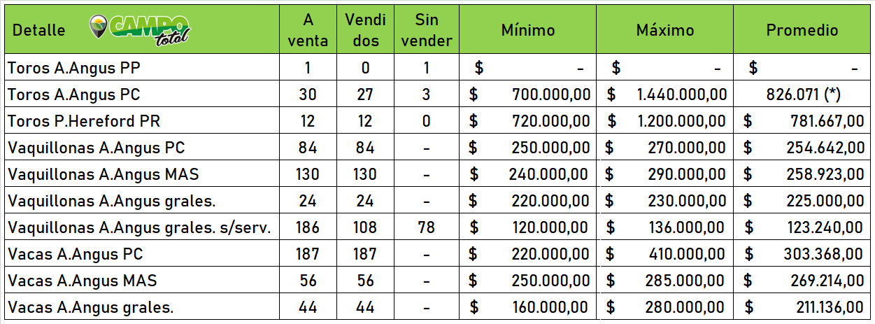 (*) Se vendieron 27 toros de cabaña Los Cerritos a un promedio de 828.889$. Se vendió un toro de cabaña La Guagua en 750.000$ quedando 3 toros sin vender.