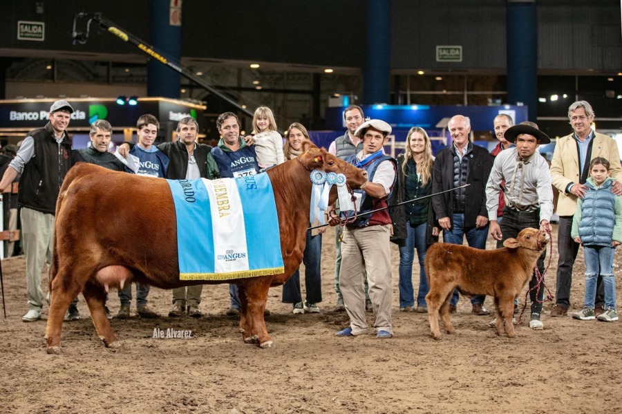 Campeón Vaca con cría: Lote 317 de Don Florencio de Oscar Busquet en co propiedad con Santiago Fernandez. Reservado el lote 322 de Los Murmullos de Cia Argentina de Haciendas en co propiedad con VWSA. Tercero el lote 319 de La Angelita de Salvini