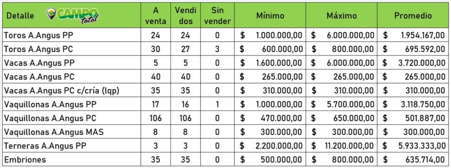 En la previa, con la presencia de Alfonso Bustillo y los agradecimientos por la realización del remate en lo que Carlos Fernández consideró “mi segunda casa”, las ventas fueron ágiles, con la venta de unos 6 animales al 50% arrancando por las menores, donde las terneras Aberdeen Angus puras de pedrigee, promediaron casi 6 millones de pesos, con buenos promedios tanto para las vacas como las vaquillonas.