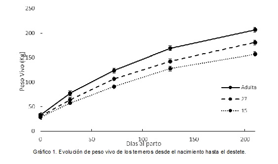 El peso al nacer de los terneros de las vaquillonas de 27 meses y las de 15 meses de edad “fueron similares y no así el de los terneros de la multíparas que fueron mayores”. Sin embargo los técnicos comentan que “al destete, los terneros de las vaquillonas 15 meses fueron 48,3kg y 23kg más livianos que los hijos de multíparas y de las vaquillonas de 27de edad, respectivamente”. A su vez, “los hijos de multíparas fueron 25,3kg más pesadas que los de las vaquillonas de 27 meses” y según los profesionales del INTA “esto fue producto de mayores ADPV de los hijos de las vacas multíparas con respeto a las vaquillonas de 27 meses y estas últimas con respecto a los de las vaquillonas de 15 meses de edad”, la evolución de peso vivo de los terneros se encuentra en el siguiente gráfico.