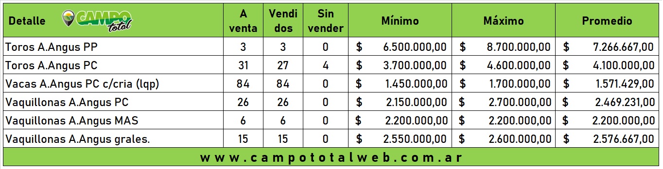 Con este “Angus Colorado” como primer remate exclusivo de ese pelaje y a la vez, con la primera televisación por Canal Rural, las ventas comenzaron con el toro de Pedigree que ya preofertados los tres, salieron rápidamente en las manos, con el mejor valor para el “Torcasita Delta”, comprado en 8.7 millones de pesos.