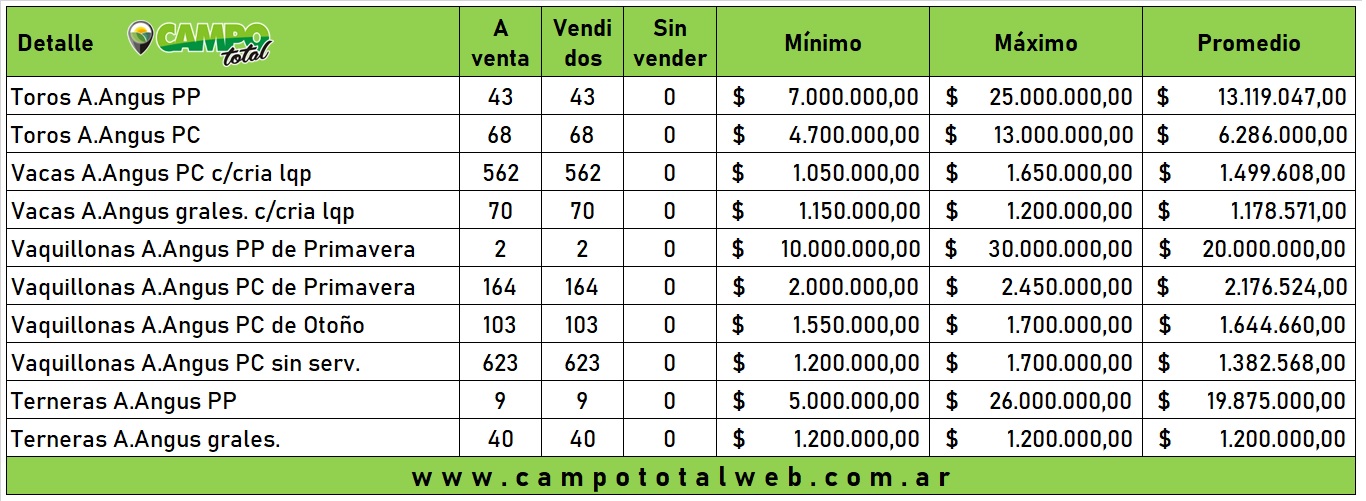 Gran oferta genética de criadores y cabañas como Arandú, La Tortuga, La Reserva, El Volcán, San Agustín, Alibú, Don Carlos, La Costera, El Rosario y Angus del Sur. Sin dudas un enorme esfuerzo para semejante ofrecimiento en prácticamente todas las categorías.