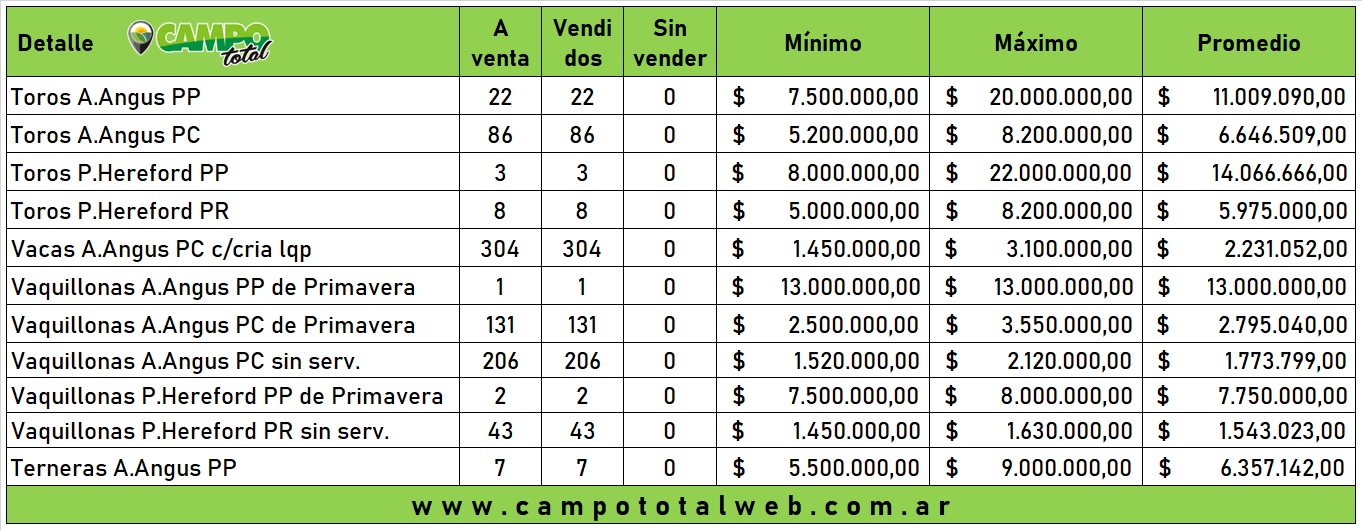 Luego fue lugar para las “sin servicio” tanto las Angus como las Hereford y para finalizar una oferta muy importante de toros: fueron 86 toros Angus puros controlados y 8 puros registrados. El Angus con destacados lotes de colorados que llegaron a los 8 millones de pesos pero que en el conjunto de toda la torada de todos los Angus mediaron los 6.646.509$ y para finalizar con los Pampas, que siempre tienen su mercado para la cabaña.