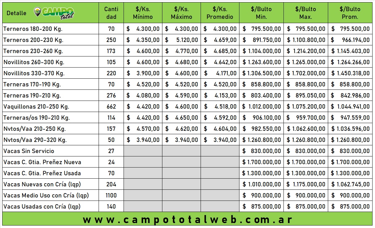 Ejemplo de eso fueron terneros de 215 kilos a 5.120 pesos o novillitos de 370 kilos que llegaron a 4.610 pesos (ni mas ni menos que 1,7 millones de pesos). Esta por demas claro que lo mejor ocurró cada vez que apareció la calidad y el pelo definido.