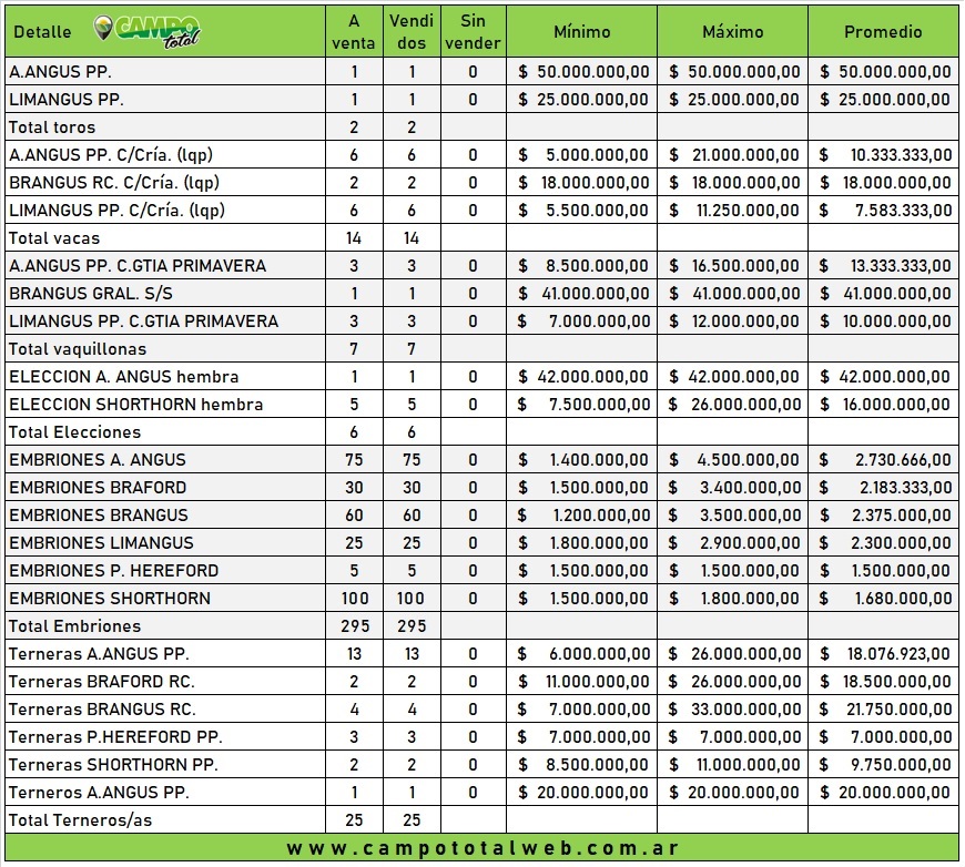 Del primer al ultimo lote -se vendieron mas de 100- el remate fue contundente. Un concierto de manos, interés, pujas y valores importantísimos. Alternado razas y martillos el remate fue ágil, con muchos lotes a venta, con teléfonos sonando y manos arriba en cada lote. Con la base importantes de las preofertas -algunas con hasta 15 realizadas- el remate fluyó, alcanzando valores realmente importantes tanto para embriones, semen, elecciones y como siempre animales compartidos al 50%.