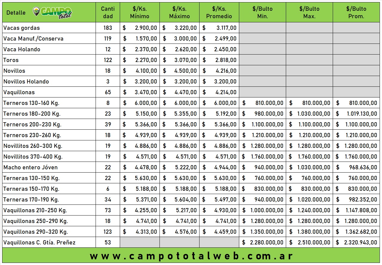 Meta y ponga, fiel a su estilo, al galope nos llevó recorriendo los corrales. Primero con un muy buen consumo que sorprendió llegando a los 4.500 pesos, luego con la vaca que siempre se destaca mucho con tope de 3.220 pesos de maximo o los 3.170 pesos para un lote que acusó en la balanza 700 kilos. Completando el paño un muy buen número de toros que pasaron los tres mil pesos.